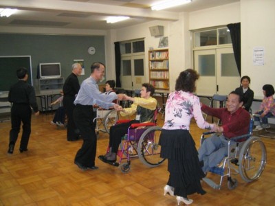 車椅子ダンスは立ち方(健常者)がリード役となって車椅子の方と踊るものですが、リード役の男女ともダンス用のシャツやブラウスにズボンやスカート、それにダンスシューズでダンスを心から楽しめるような雰囲気を作っておられるのが印象に残りました。