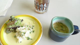 ![]() 試食メニュー なすのずんだ和え、冷汁、大根の菜めし